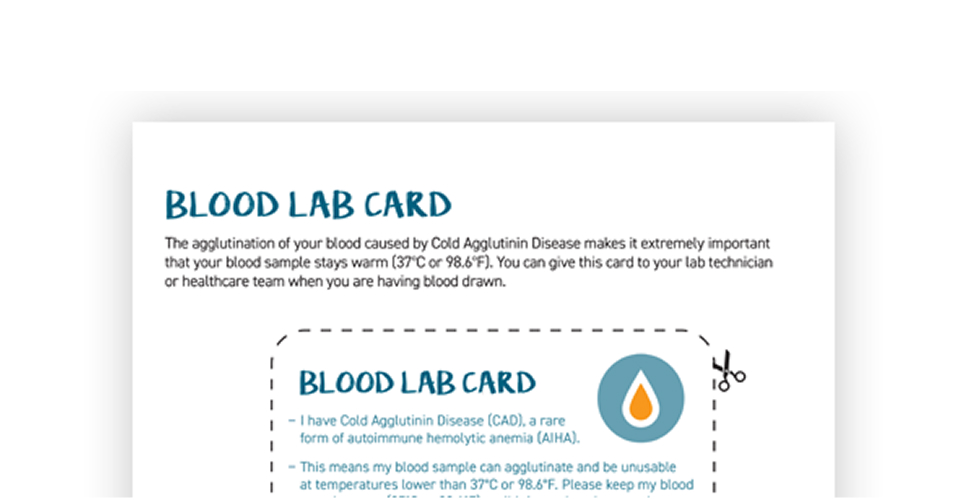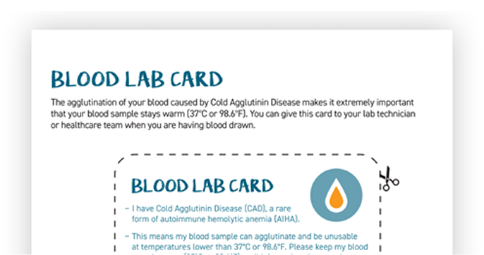 Because Cold Agglutinin Disease is associated with colder temperatures, it's extremely important that your blood stays warm. Use this card to help ensure that healthcare providers and support staff are handling your blood properly.